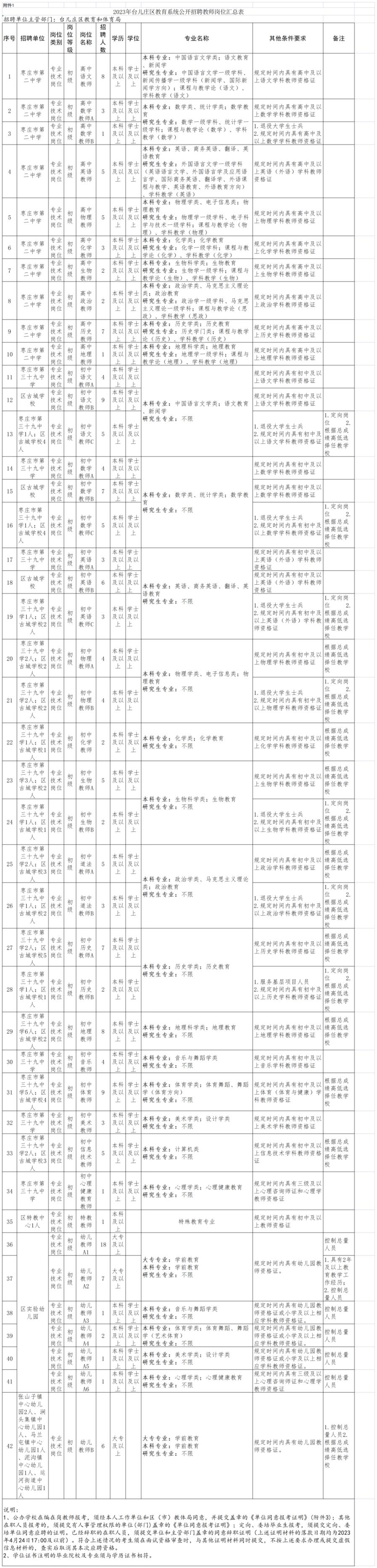 (四)招聘岗位要求的专业、学历学位、教团队格条件,详见《2023年台儿庄区教育系统公开招聘教师岗位汇总表》(附件1,以下简称《岗位汇总表》);