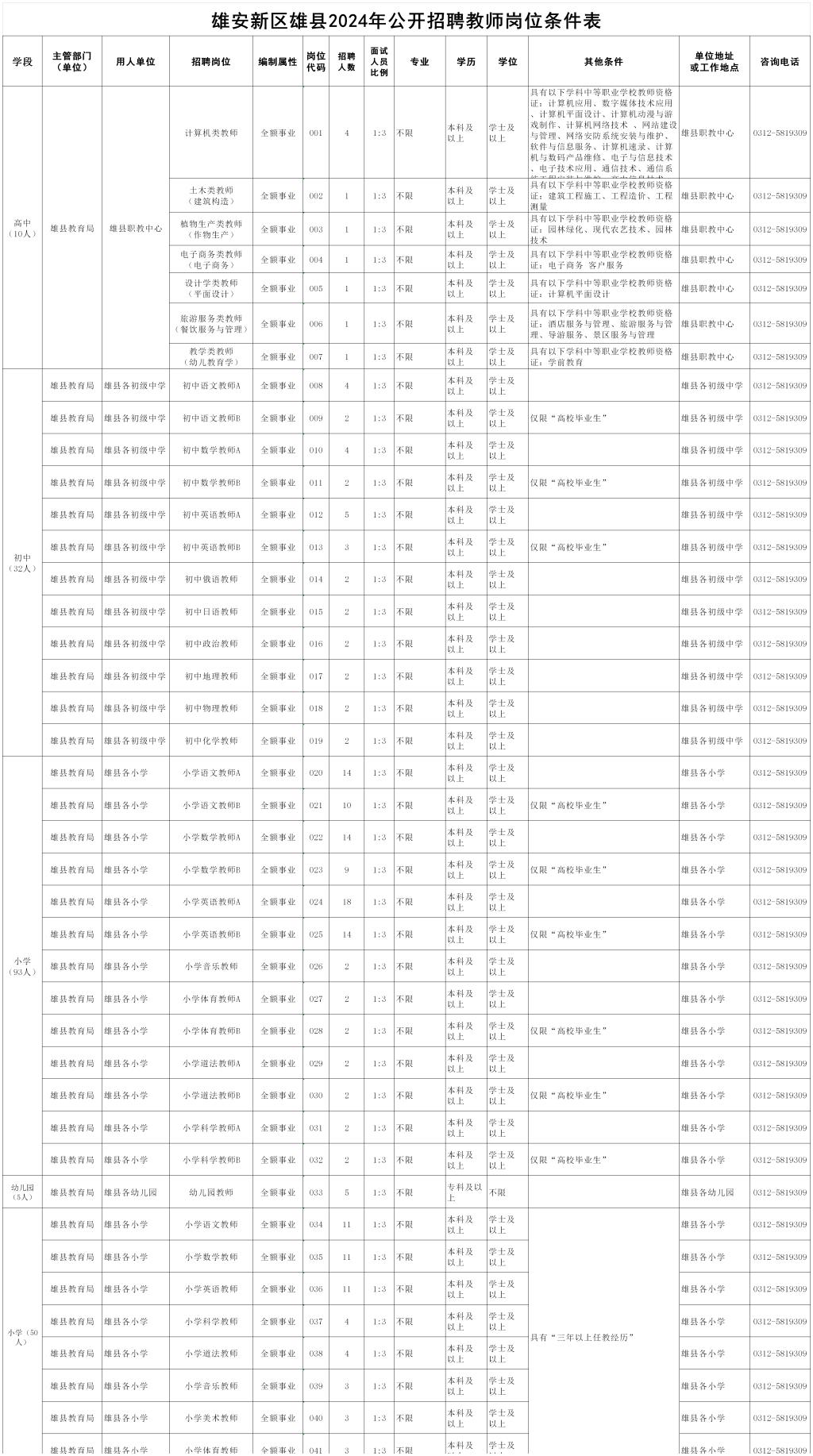 具体招聘人数和岗位条件详见《雄安新区雄县2024年公开招聘教师岗位条件表》(附件)。